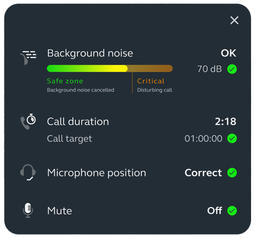 Engage+ delivers live on-screen pop-ups with guidance on factors affecting your customer’s call experience, including background noise, the position of your microphone, silence, and interruptions. 1