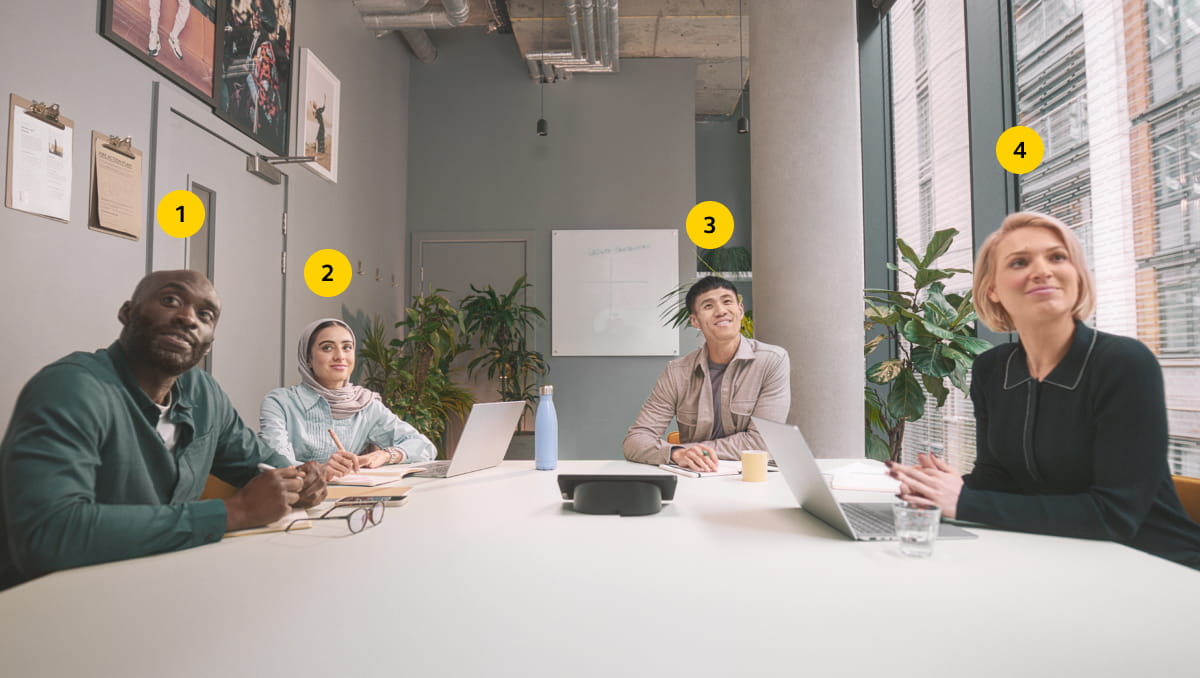 It adapts to whatever space they’re in, using four powerful speakers in a zero-vibration stereo setup to flood the room with premium high-definition sound. That means even those sat all the way at the back will still know exactly what’s going on. And remote participants will hear things perfectly too.