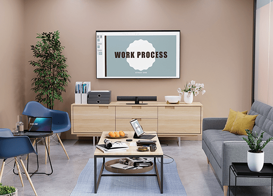 Teile den Inhalt deines Whiteboards mit der integrierten Content-Kamera für Whiteboard-Sharing: Sie zeigt gleichzeitig deine Whiteboard-Inhalte und die Teilnehmer:innen im Meetingraum an.