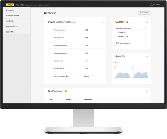 Mit Jabra Plus kannst du alle deine Geräte an einem Ort anzeigen, verwalten, steuern und aktualisieren. Mit unserer umfassenden Gerätemanagement-Plattform stellst du unkompliziert sicher, dass deine Teams ohne große Geräteausfälle und Unterbrechungen arbeiten können – egal, wo sie sich befinden.