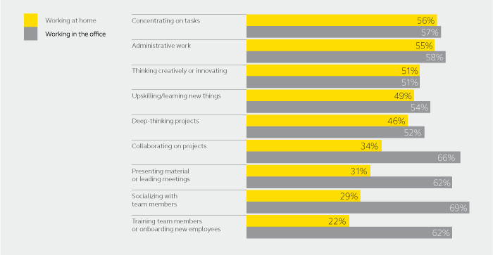 So much so, that most employees now consider the majority of their tasks as possible from home. Our research showed that knowledge workers feel most tasks can be better accomplished from home, with the exception of collaborative work, where engagement, socializing, meetings, and onboarding new employees are considered far more effective in person.