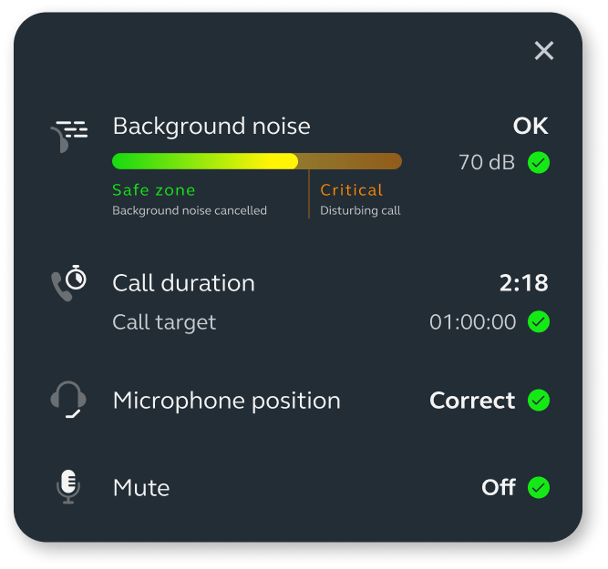 Silenzi imbarazzanti, audio incomprensibile, interruzioni, rumori di sottofondo e altro ancora: al di là della conversazione stessa, sono tanti i fattori che possono influenzare l'esperienza del cliente. Engage+ è il nostro nuovo widget di feedback in tempo reale. Grazie a notifiche immediate, gli operatori possono concentrarsi sui clienti e intraprendere azioni correttive per migliorare l'esperienza di chiamata nel momento stesso in cui interagiscono con loro. Incluso con le cuffie Jabra Engage 50 II e 40, questo software rappresenta un punto di svolta per i tuoi operatori e clienti.