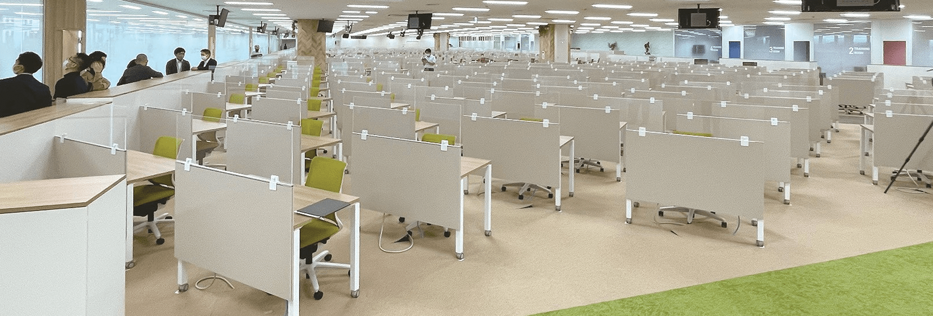 同社コンタクトセンターを見学すると、まず驚くのは珍しい席のレイアウトだ。オペレーターやSVの席が扇状に並び、ソーシャルディスタンスが確保された通気性の良いフロアになっている。