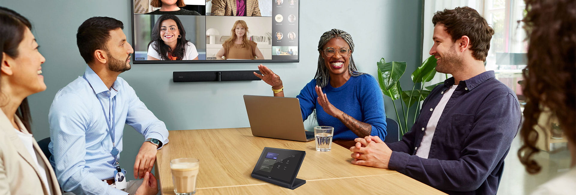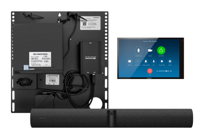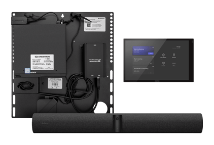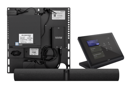 System konferencyjny Crestron Flex do małych pomieszczeń oraz Jabra® PanaCast 50 Video Bar do stosowania z Microsoft Teams® Rooms