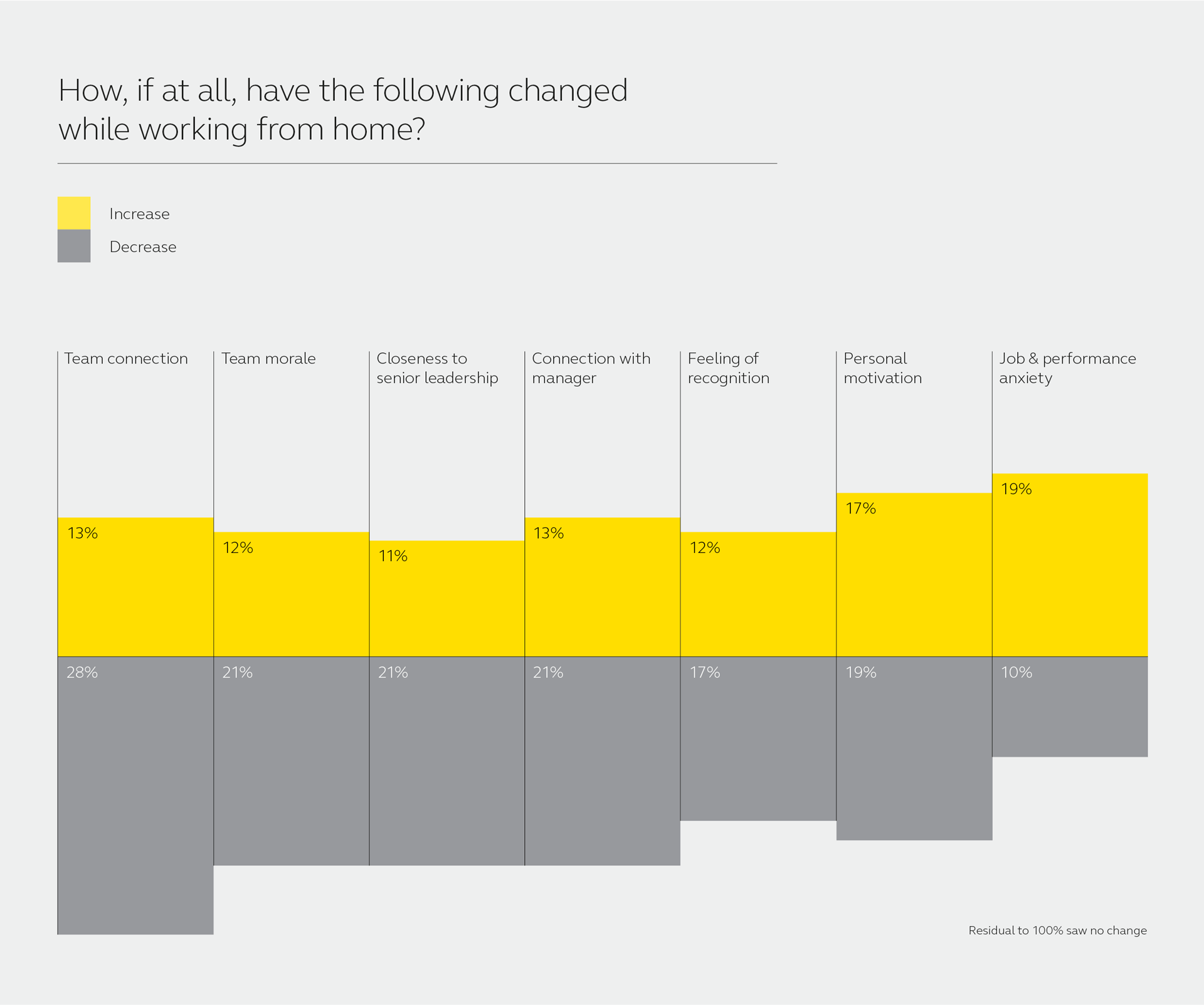 While working remotely, anxiety levels rose, people worked far longer hours, and our research showed that lacking boundaries between our personal and professional lives consistently ranked as one of the biggest challenges around the world while working from home. During remote work, our research showed that sense of connection amongst teams decreased 28%, feelings of recognition decreased 17%, and employees’ feeling of closeness to their direct manager decreased 21%.